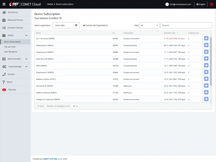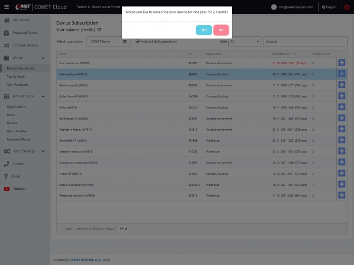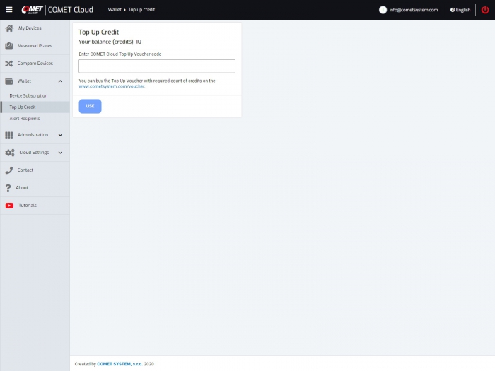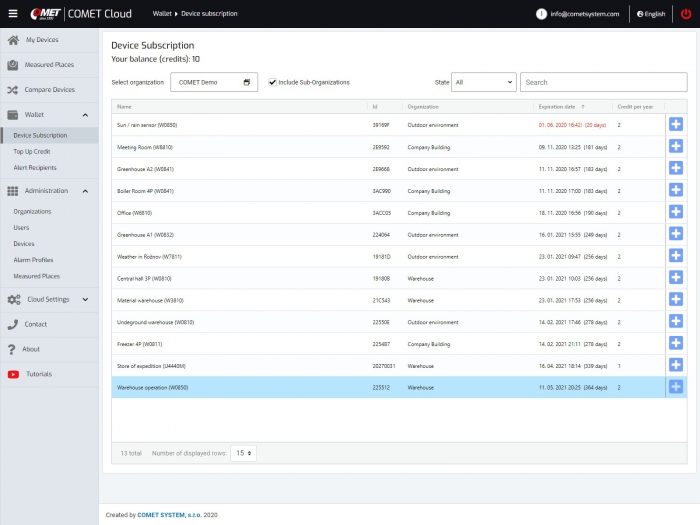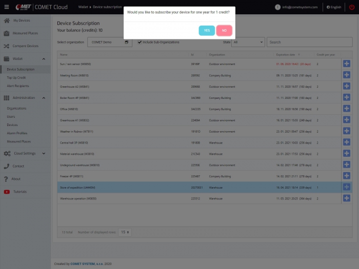 At any time you have the option to purchase a recharge coupon for 1 year, 2 years or more years of operation of the device. Extension of the subscription for individual devices is realized through credits from the wallet, which is built into the COMET Cloud.